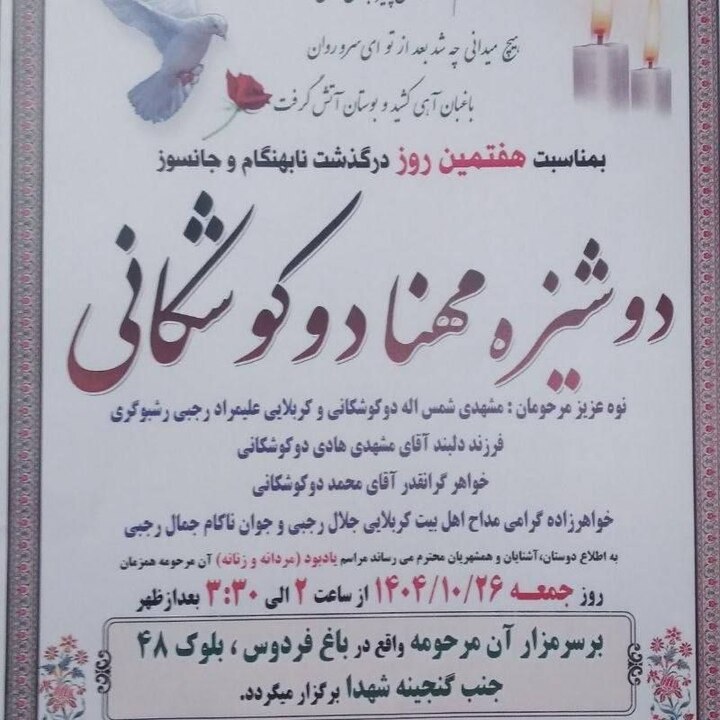 The image pertains to the obituary notice and her memorial ceremony at the “Bagh-e Ferdows” cemetery in Kermanshah;