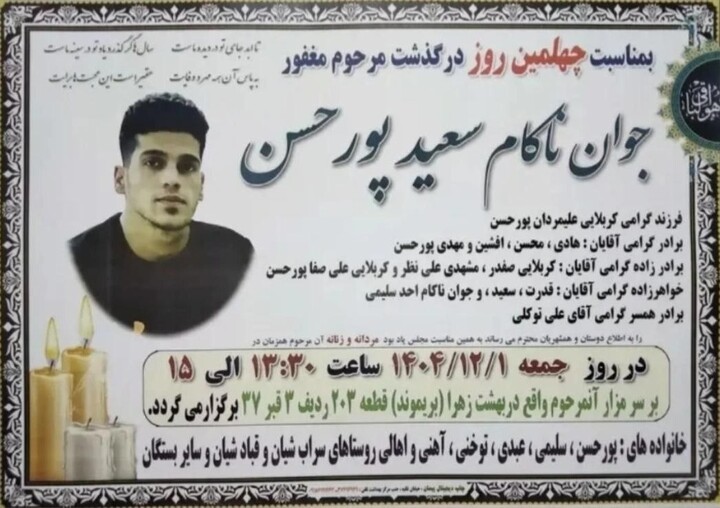 February 19, 2026; "Saeed Pourhassan", a 26-year-old Kurdish youth from "Eslamabad-e Gharb" (Shabad) in the province of "Kermanshah", is the identity of another victim of the popular protests on January 9, 2026, on "Saadi" Street in Eslamabad-e Gharb, who was killed by live ammunition fire from the repressive forces of the Islamic Republic government.
