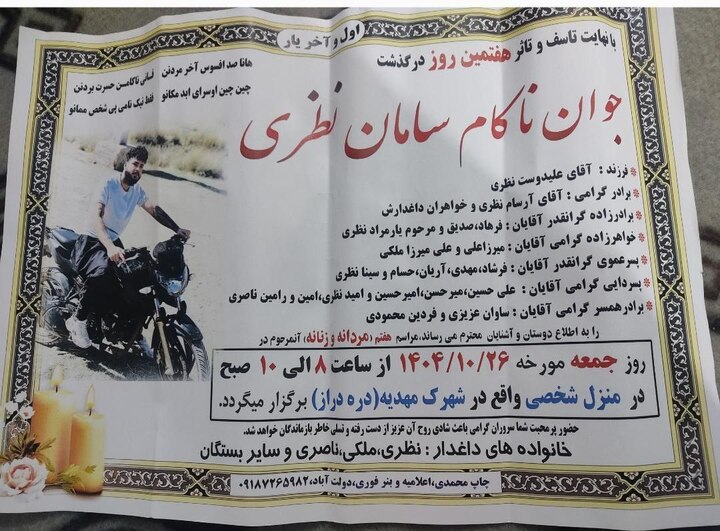 February 6, 2026; “Saman Nazari,” a 21-year-old Yarsani Kurdish youth from “Kermanshah,” is the identity of another victim of the popular protests of January 8, 2026, in the “Darreh Derizh” neighborhood of “Kermanshah.” He lost his life due to the direct firing of a live bullet by the repressive forces of the Islamic Republic to the eye area.