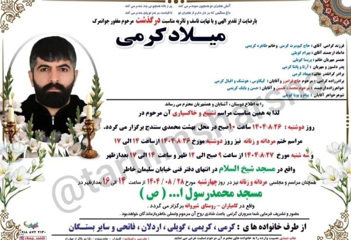 روز یکشنبه ۲۵ آبان ۱۴۰۴؛ یک شهروند کُرد اهل کامیاران و ساکن سنندج به نام «میلاد کرمی»، توسط نیروهای نظامی جمهوری اسلامی در ایست بازرسی ورودی تکاب با شلیک مستقیم گلوله جنگی به قتل رسید.