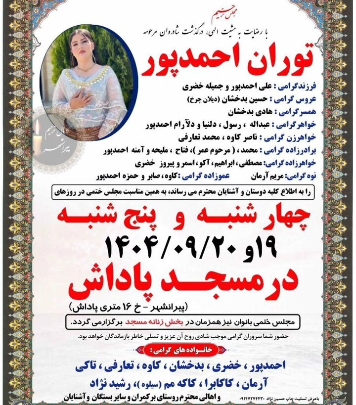 ۲۰ آذر ۱۴۰۴؛ روز سهشنبه ۱۸ آذر ۱۴۰۴، «توران احمدپور»، زن جوان اهل پیرانشهر و ساکن روستای «دیلانچرخ سفلی» از توابع نقده، با اقدام به خودکشی از طریق حلقآویز کردن به زندگی خود پایان داد.