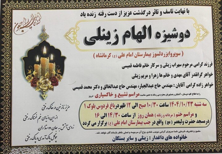 تصویر مربوط به برگه آگهی ترحیم الهام زینلی است؛