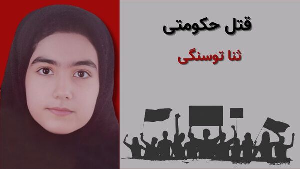 هشتم بهمن ۱۴۰۴؛ «ثنا توسنگی»، دانشآموز ۱۲ ساله، از کوردهای کرمانشاه و ساکن «هشتگرد» اصفهان، هویت یکی دیگر از جانباختگان اعتراضات مردمی ۱۹ دی در «هشتگرد» است که با شلیک مستقیم و هدفمند گلوله جنگی نیروهای سرکوب جمهوری اسلامی از ناحیه کمر و پشت گردن، با سلاح جنگی «کلاشینکوف» هدف قرار گرفت و در دم جان خود را از دست داد.