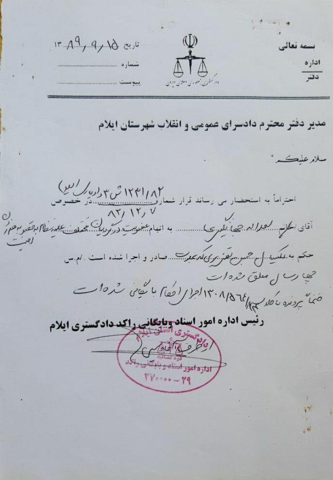 از دیگرسو، در سال ۱۳۸۹، دادسرای عمومی و انقلاب استان ایلام او را به اتهام «عضویت در گروههای مختلف علیه نظام به قصد برهم زدن امنیت» به یک سال حبس تعزیری با چهار سال تعلیق محکوم کرد؛ حکمی که نشاندهنده پروندهسازی امنیتی ـ قضایی علیه او بود.