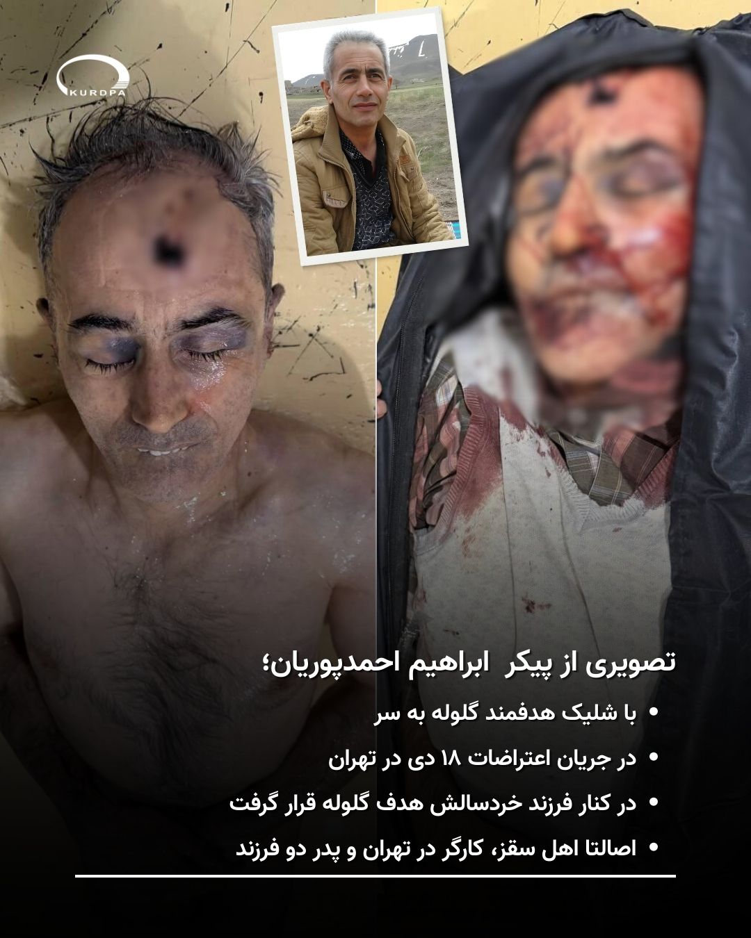 ۲۲ دی ۱۴۰۴؛ «ابراهیم احمدپوریان»، شهروند کُرد اهل سقز و ساکن تهران، هویت یکی دیگر از جانباختگان اعتراضات ۱۸ دی ۱۴۰۴ در تهران است که برای «کُردپا» تأیید شده است.