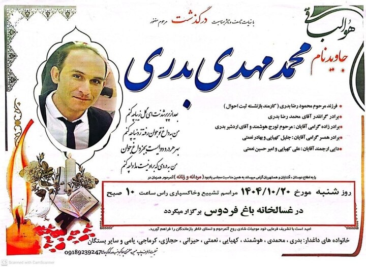 ۳۰ دی ۱۴۰۴؛ «محمدمهدی بدری»، جوان کُرد اهل کرمانشاه، هویت یکی دیگر از جانباختگان اعتراضات مردمی ۱۸ دی در کرمانشاه است که با گلوله جنگی نیروهای سرکوب جمهوری اسلامی کشته شده است.