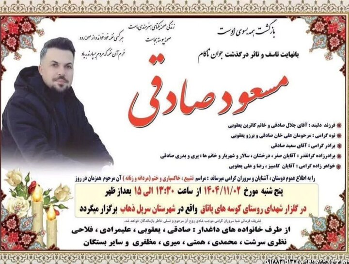 یکم بهمن ۱۴۰۴؛ «مسعود صادقی»، جوان ۳۷ ساله کُرد اهل شهرستان «سرپلذهاب» از توابع استان کرمانشاه، هویت یکی دیگر از جانباختگان اعتراضات مردمی ۱۹ دی در تهران است که با گلوله جنگی نیروهای سرکوب جمهوری اسلامی کشته شده است.