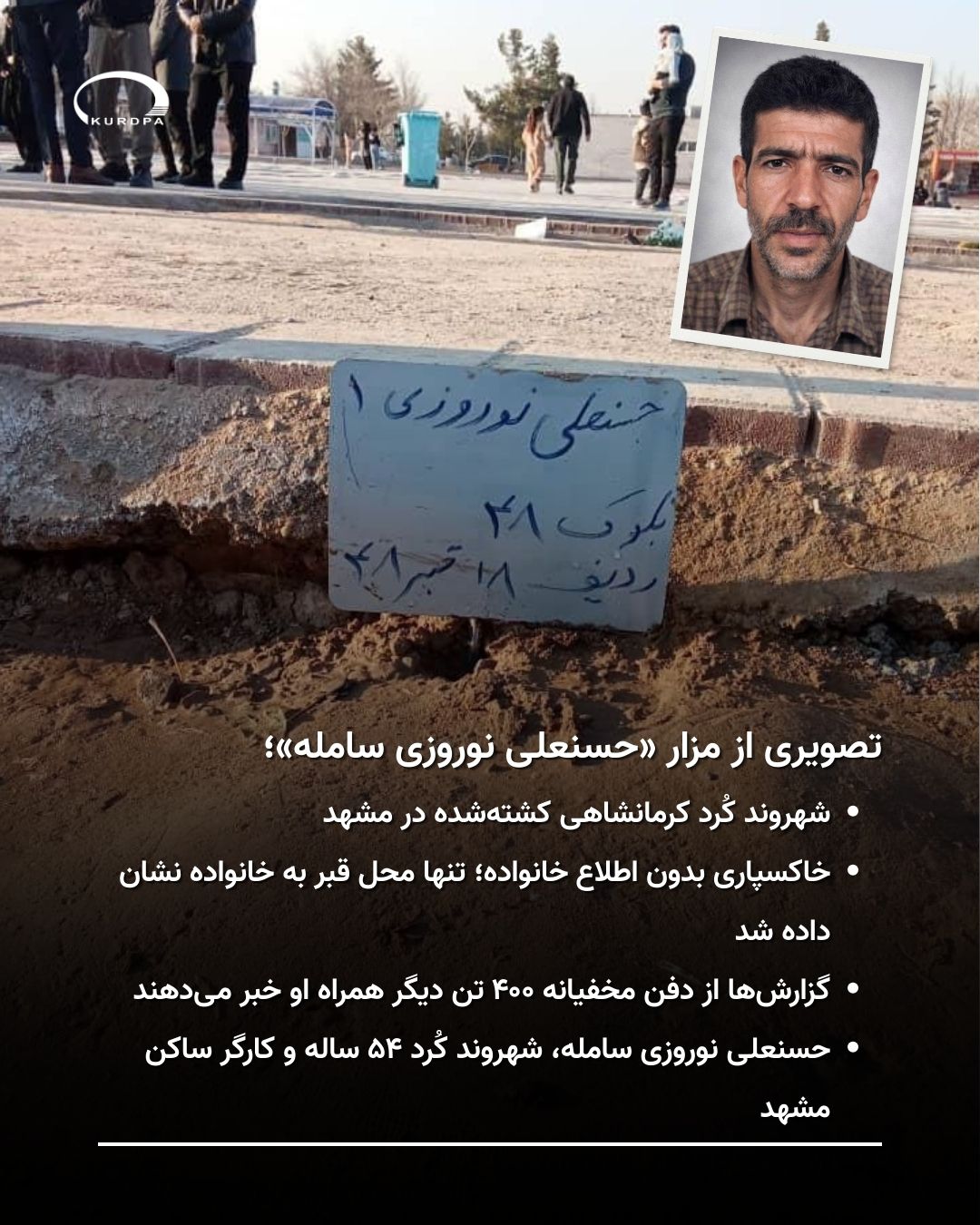 مشهد؛ حسنعلی نوروزی سامله، شهروند ۵۴ ساله کُرد کرمانشاهی، از کشتهشدگان مشهد نزدیکان از خاکسپاری مخفیانه ۴۰۰ تن در مشهد خبر دادهاند