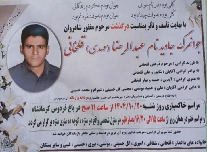 ۲۵ بهمن ۱۴۰۴؛ «عبدالرضا (مهدی) قلخانی»، جوان ۴۲ ساله کُرد اهل کرمانشاه، هویت یکی دیگر از جانباختگان اعتراضات مردمی ۱۸ دی ۱۴۰۴ در کرمانشاه است که با شلیک گلوله جنگی نیروهای سرکوب حکومت جمهوری اسلامی کشته شد.