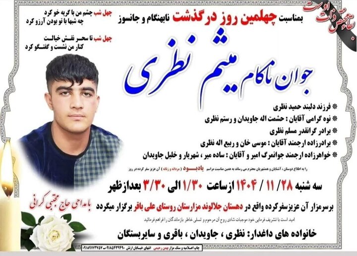 ۲۶ بهمن ۱۴۰۴؛ «میثم نظری»، جوان ۴۲ ساله کُرد اهل کرمانشاه، هویت یکی دیگر از جانباختگان اعتراضات مردمی ۱۹ دی ۱۴۰۴ در کرمانشاه است که با شلیک گلوله جنگی نیروهای سرکوب حکومت جمهوری اسلامی کشته شد.