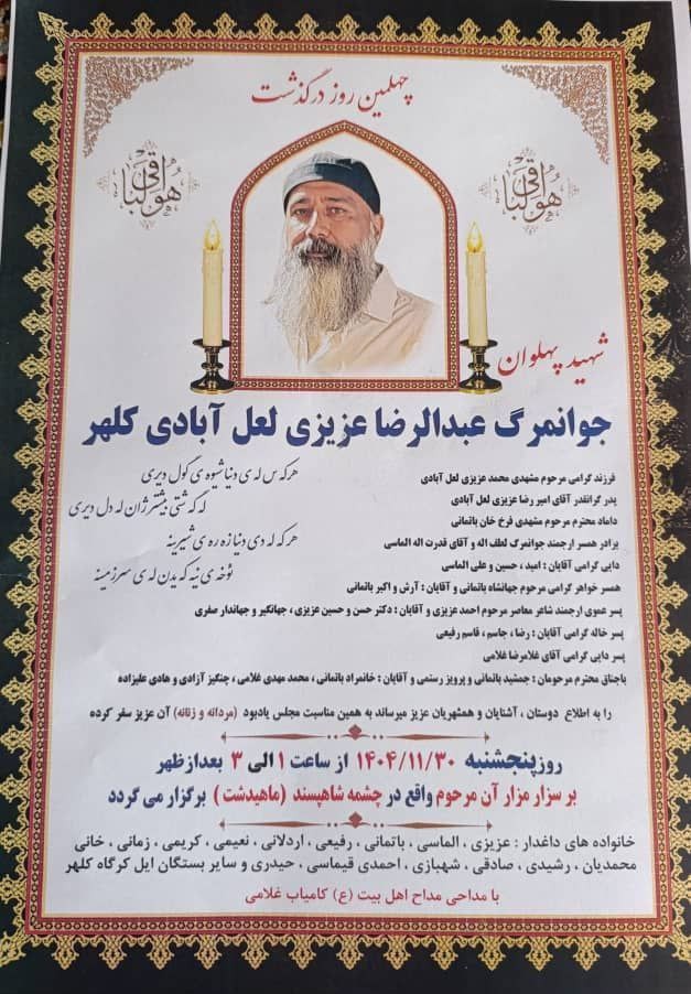 ۲۸ بهمن ۱۴۰۴؛ «عبدالرضا عزیزی لعلآبادی کلهر»، شهروند ۴۸ ساله کورد اهل کرمانشاه، هویت یکی دیگر از جانباختگان کرمانشاه است که در جریان اعتراضات مردمی ۱۸ دی ۱۴۰۴ در محله «مسکن» کرمانشاه با شلیک گلوله جنگی نیروهای سرکوب حکومت جمهوری اسلامی بهشدت زخمی شد و پس از دو روز بستری شدن در بیمارستان «حکیم» بر اثر شدت جراحات جان باخت.