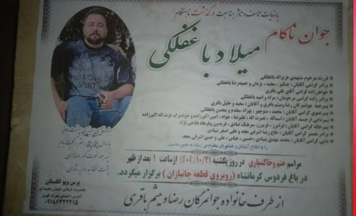 تهران؛ میلاد باغفلکی، جوان ۳۵ ساله کورد کرمانشاهی، هویت یکی دیگر از جانباختگان ۱۸ دی کشتهشده با گلوله جنگی در فلکه پنجم فردیس کرج