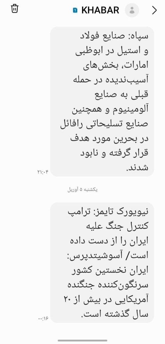 همچنین بهصورت مستمر پیامکهایی به تلفن همراه شهروندان ارسال میشود که عمدتا شامل اخبار مرتبط با حملات سپاه پاسداران به منطقه و نمایش برتری جمهوری اسلامی ایران در این حملات است. از جمله این پیامها میتوان به مواردی درباره «حمله به صنایع فولاد و استیل در امارات، صنایع تسلیحاتی در بحرین و نابودی آنها»، و نیز بازنشر گزارشهایی از رسانههای خارجی اشاره کرد که در آنها عباراتی مانند «ترامپ کنترل جنگ را از دست داده» یا «ایران نخستین کشور سرنگونکننده جنگنده آمریکایی است» مطرح شده است.